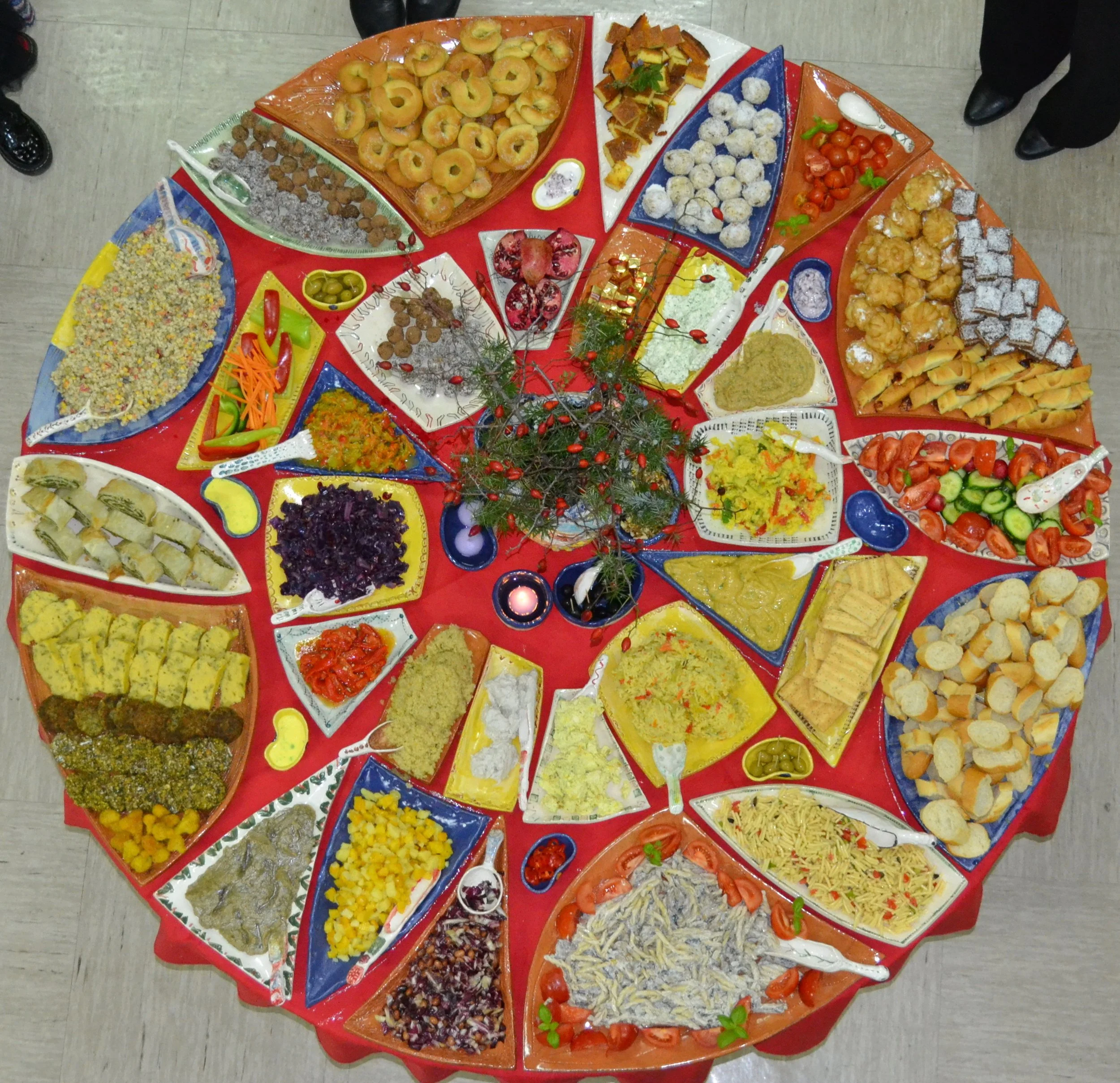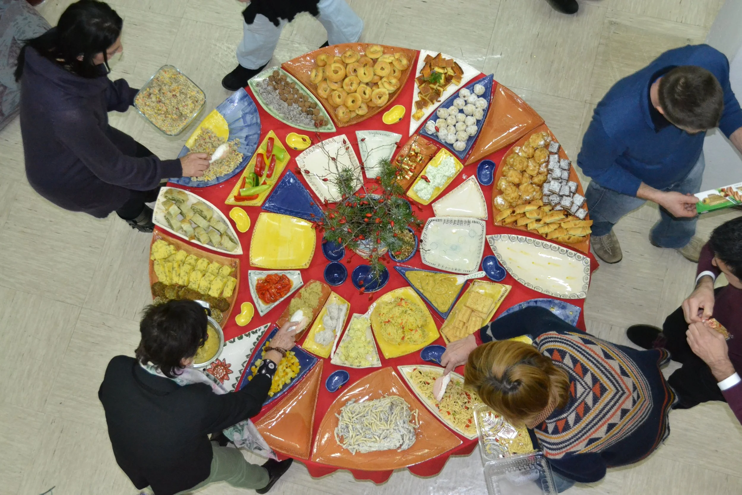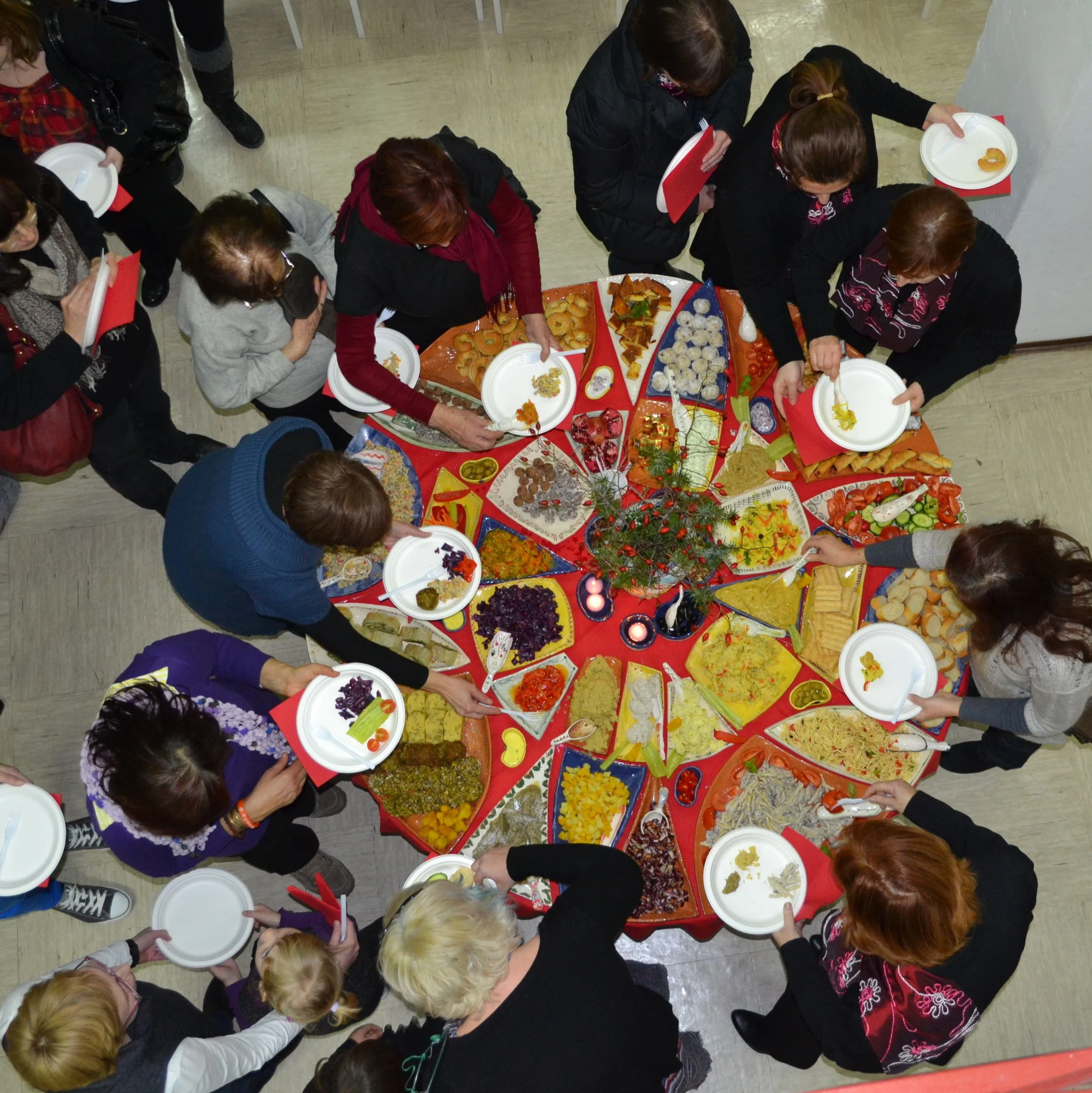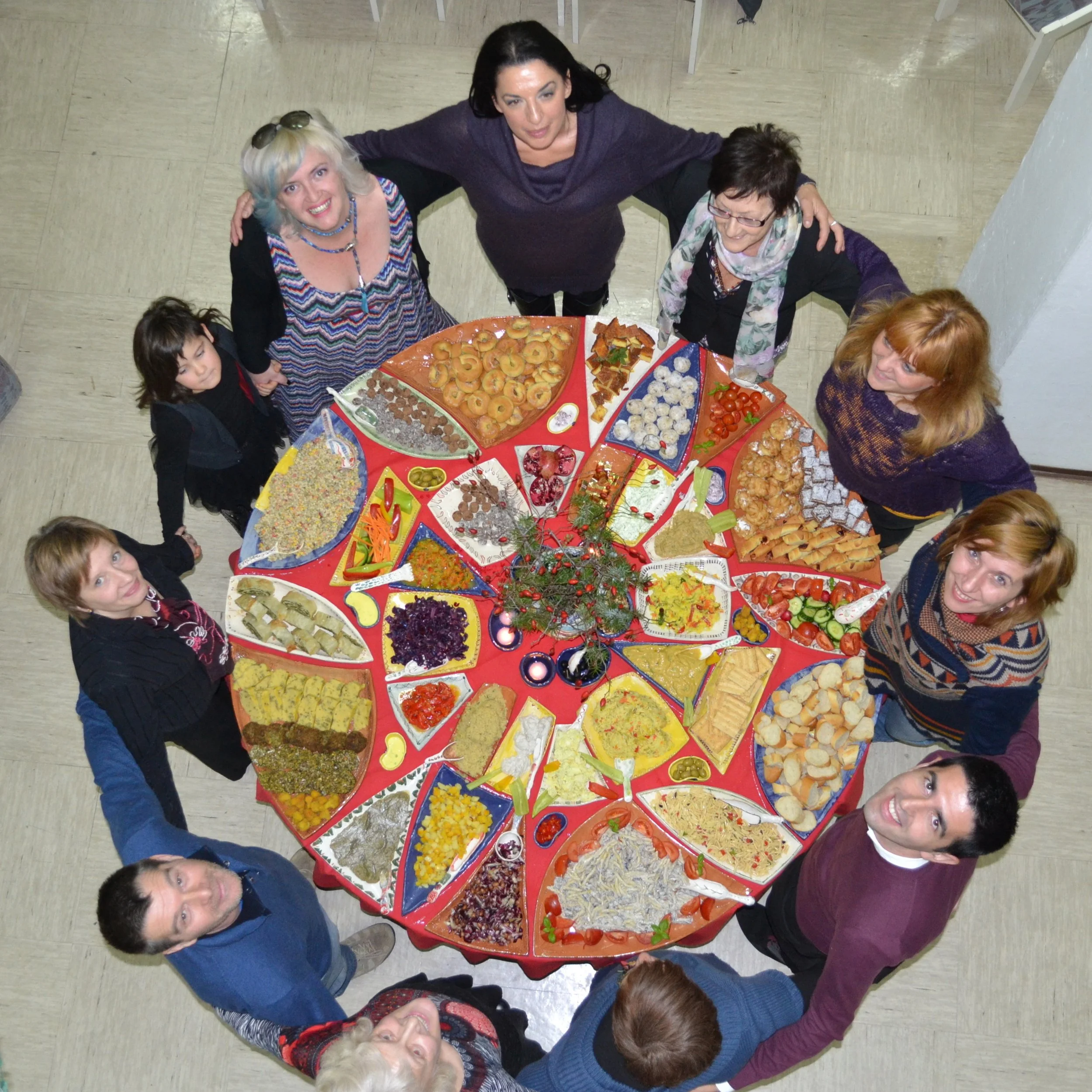 The project culminated in a community dinner around the mandala table, featuring vegetarian food, live music, and poetry. Held just before Christmas, the gathering also included a donation drive, with groceries and homemade cookies distributed to elderly residents in collaboration with a local charity.